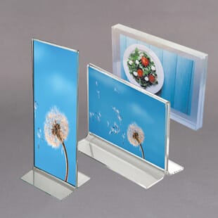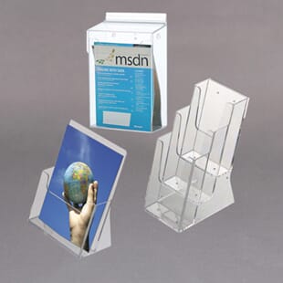Vi lagerfører et stort antall varianter brosjyreholdere, samt menyholdere for tosidig bruk eller skråstilte for ensidig. Leter du etter brosjyreholdere for utendørs bruk, se i kategorien "Brosjyreholdere i akryl". Noen for gulv eller vegg, andre for bord og disk. Alt i transparent kvalitets akryl.