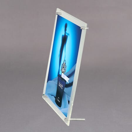 Akryl menyholder med føtter i aluminium/ sølv. perfekt til menyer. tilbud, informasjon og prislister. 10x21cm M65