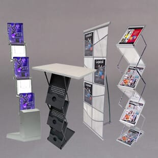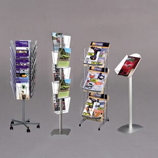 Vi lagerfører ett stort utvalg av brosjyrestativer, både gulv og vegg modeller, samt sammenleggbare brosjyrestativer til bruk på messer osv. Andre modeller kan skaffes på førespørsel. Last gjerne ned vår katalog på displayutstyr om du ikke finner det du leter etter på vår web side.
