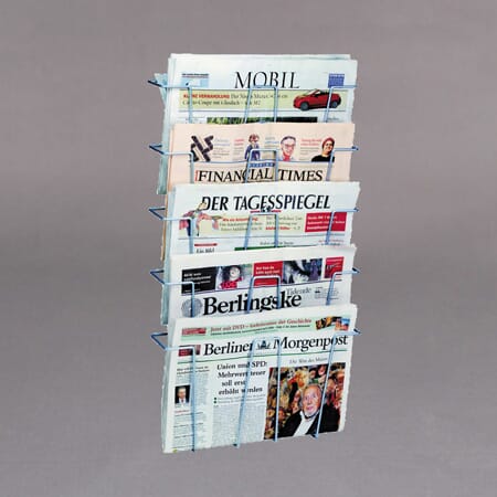 Brosjyrestativ i solid tråd med plass til 5 aviser i tabloid format