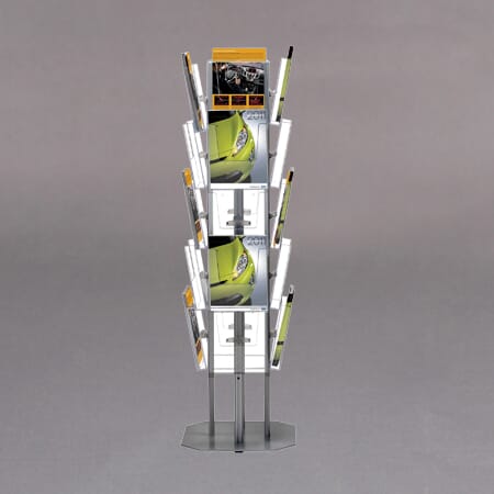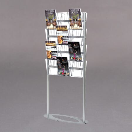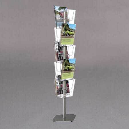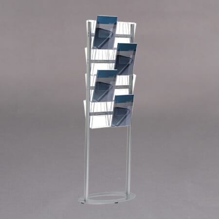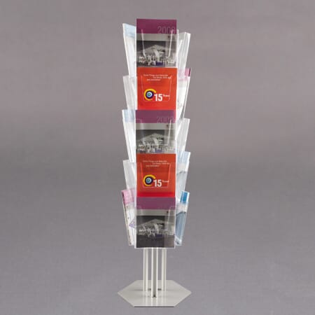 Brosjyrestativ i aluminium med pulverlakkert grå åttekantet tung fot i stål. Inkludert 20 holdere i akryl som passer til A4 brosjyrer.