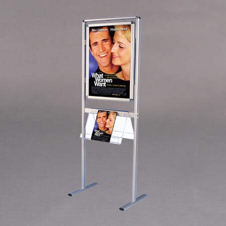 Kombinert info- og brosjyrestativ i aluminium med A1 snap ramme. runde hjørner i krom. 32 mm aluminiumsprofil, antirefleks frontplate og 4 mm akryl holder til A4 brosjyrer.