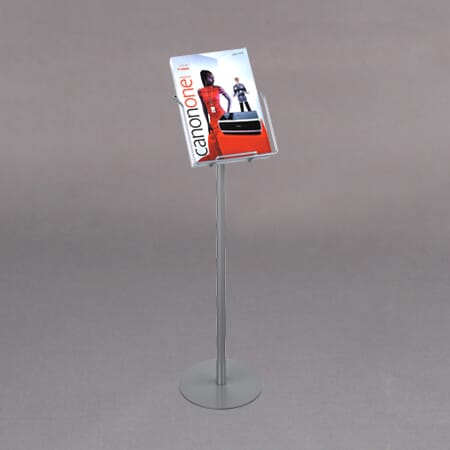 Brosjyreholder i tabloid format. Utført i tråd. polyesterlakkert sølv. A4 format.