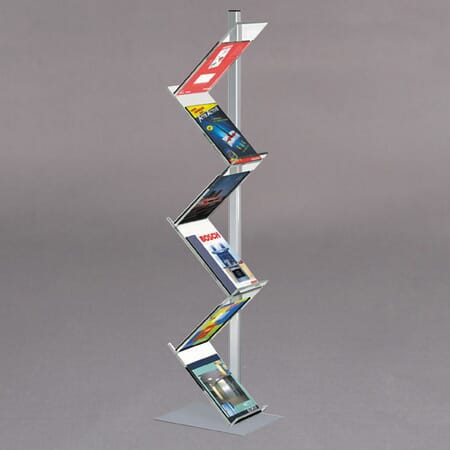 Elegant gulvstativ med acryl hyller og stang i aluminium. Plass til 6 x A4 brosjyrer.