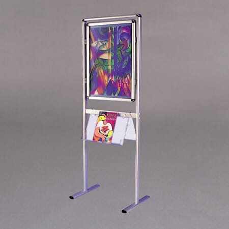 Dobbeltsidig brosjyrestativ med acryl hylle og snap ramme i A1 størrelse. Kan også leveres enkeltsidig.