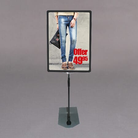 Sjokkselger med plakatramme i størrelse A5. Leveres med ABS plastramme. holder ,fleksibel teleskopstang 30-60cm og metallfot. Sort ramme. Uten APET plastomslag. For innendørs bruk.