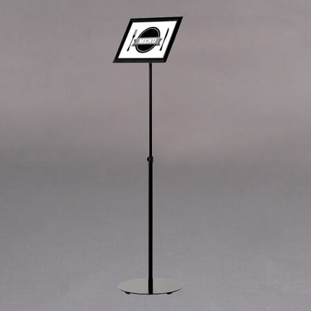 Sort aluminium infostand/brosjyrestativ med teleskopstang og rund fot. Høyden kan reguleres mellom 80 og 130cm. Leveres med en 25mm A4 snap ramme med APET antireflex frontplate. Rammen kan monteres vertikalt eller horisontalt på stativet.