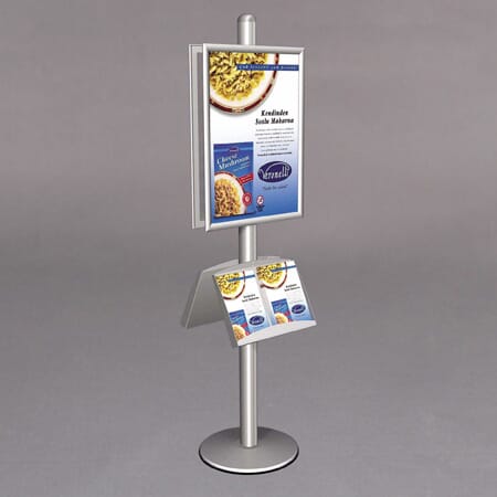 Dobbel multistand med hylle og ramme på hver side. Plass til 4 x A4 eller 2 x A3. 2 stk rammer 50x70cm. Elegant og meget stødig stativ.