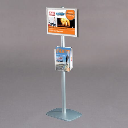Enkeltsidig justerbar multistand med 25 mm aluminiums snap ramme. Stativet kan monteres med opptil tre rammer på begge sider. Lett å justere. kan leveres med horisontalt eller vertikal montert ramme. Dekorativ fot med elegant design. Til innendørs bruk