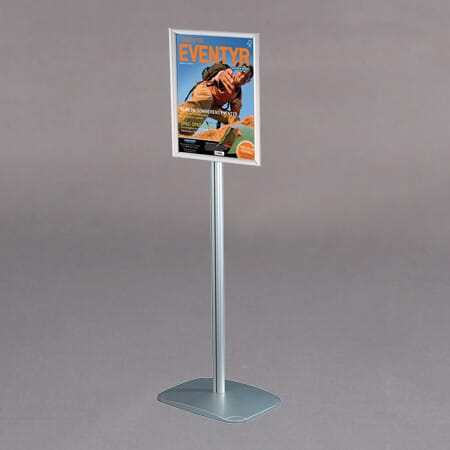 Enkeltsidig justerbar multistand med 1 stk25 mm aluminiums snap ramme. Stativet kan monteres med opptil tre rammer på begge sider. Lett å justere. kan leveres med horisontalt eller vertikal montert ramme. Dekorativ fot med elegant design. Til innendørs bruk