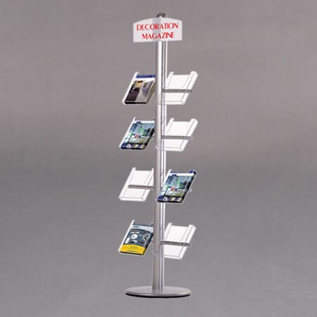 8 x A5 akryl lommer. Elegant og meget stødig stativ. samt logo plate på toppen. Logo og tekst kommer i tillegg til prisen.