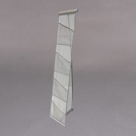 Enkeltsidig fleksibel lettvekts konstruksjon i aluminium med plass til 4 x A4 brosjyrer. Ved hjelp av klem profilen samles nett banneret meget enkelt. Leverer med sort transport bag.