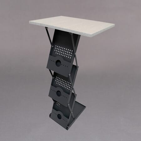 Smart sammenleggbart brosjyrestativ med bord som kan brukes til skriveunderlag. eller til å plassere en PC. 3 x A4 brosjyrehyller. Leveres med transportkoffert.
