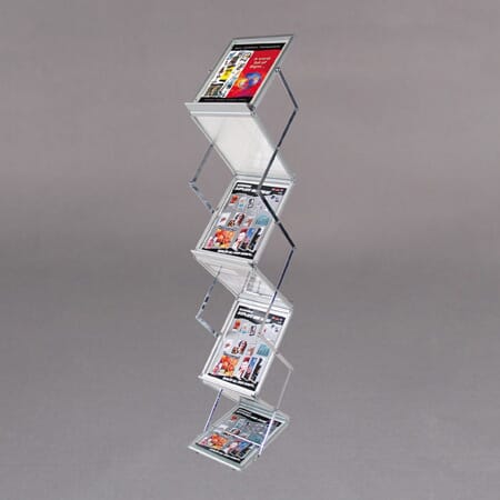 Flex sammenleggbart brosjyrestativ. Stativ i aluminium. Praktisk og elegant. Leveres med solid transport koffert.