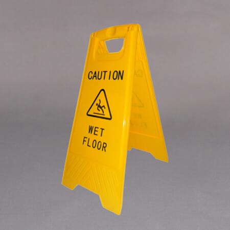 Gult informasjons skilt i solid plast med advarsel på engelsk om "Wet Floor"
