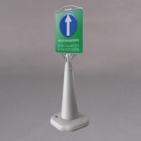 Informasjonsbukk med skilt. Utført i kraftig lys grå plast med topp skilt for folie i størrelse 33.6 x 38,5 cm. Foten kan fylles med 4,5 liter vann for å gjøre den mer stabil. Frostvæske kan brukes vinterstid.