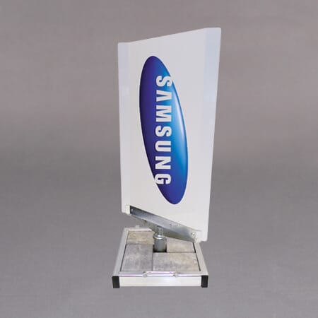 Hvit topp plate i polyester lakkert aluminium montert på galvanisert holder med dobbelt kulelager. Kraftig og stormsikker fot med 4 fliser innlagt. Montert med grep og hjul for enkel transport.