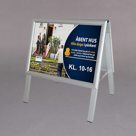 30mm klikk klakk ramme i eloksert aluminium. Ben i 25x25mm firkant rør. Bakplate i galvanisert stål. Refleksfri frontplate. Logoplate i 4mm alu dibond kan enkelt skiftes via snap profilen i toppen.