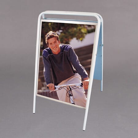 Brukes ofte som visningsbukk for eiendomsmeglere. 21mm stålrør. Ulakkert rustfri zink bakplate. Refleksfri frontplate. Kan leveres med hjul som har brems.