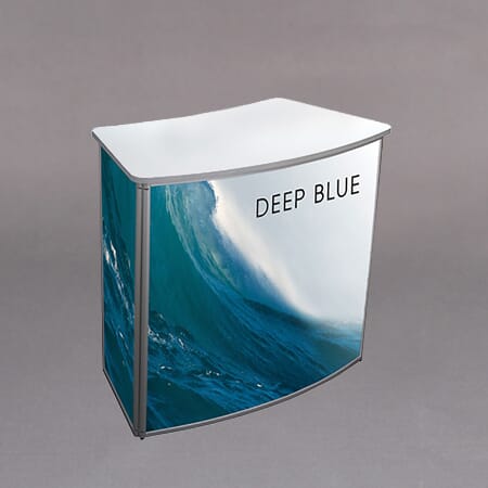 Demodisk til bruk på messer og butikkstands o.l. Leveres med aluminiumsprofiler. hvit topplate , en hylle og tre hvite paneler. Vi kan også lage print/logo mot tillegg i prisen. Tas lett fra hverandre for transport. Bag, Art.nr.46400 kan kjøpes separat. Flere modeller kan leveres. Kontakt vår salgsavdeling.