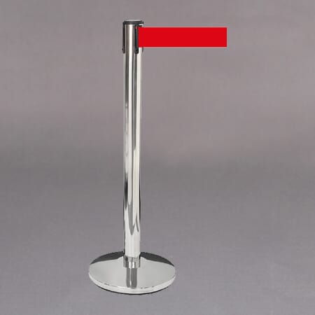 1 stk sølvfarget stolpe i stål 91cm høy til køordnersystem/ avsperringsystem. Den tunge foten på Ø32cm gjør den meget stødig. 3 meter RØDT bånd integrert i stolpen. Beslag til vegg er tilbehør.