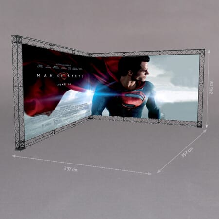 Messevegg L vinkel. Ett modul system med ubegrensede muligheter. Laget av sterke og varige materialer som aluminium. stål og kompositt. Sammenleggbar konstruksjon som gjør det enkelt å montere og demontere. Messevinkelen leveres komplett med 3 x 90 + 6 x 120 cm moduler. Se spesifikasjoner i pdf filen for mer informasjon. Prisen er uten banner, men ta kontakt så ordner vi det for deg også.