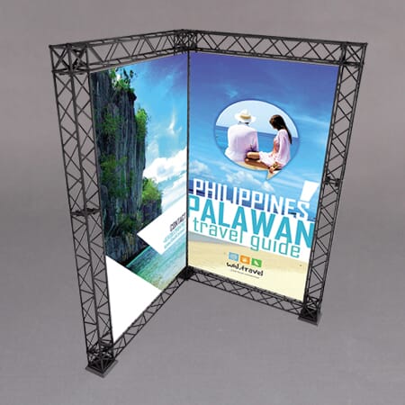 Messevegg hjørne. Ett modul system med ubegrensede muligheter. Laget av sterke og varige materialer som aluminium. stål og kompositt. Sammenleggbar konstruksjon som gjør det enkelt å montere og demontere. Messehjørnet leveres komplett med 3 x 90 + 7 x 120 cm moduler. Prisen er uten banner, men ta kontakt så ordner vi det for deg også.
