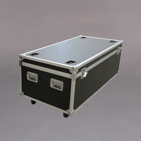 Stor transport kasse i flight case utførelse med hjul og håndtak. Kan stables.