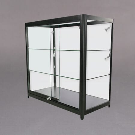 Eksklusive vitrineskap produsert i sølv eller sort eloksert aluminium. Herdet glass.
