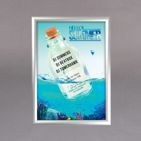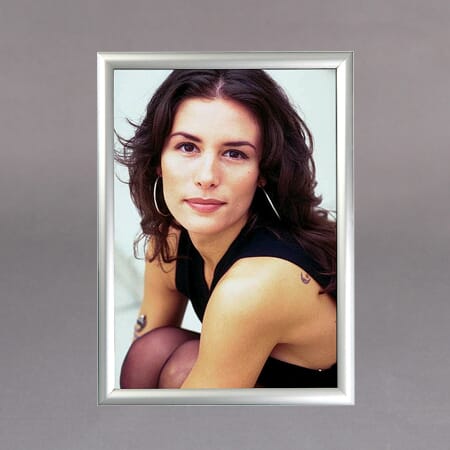 Dobbeltsidig A3 snap ramme med aluminiumsprofil og gjærede hjørner. 2 stk APET antirefleks frontplater medfølger. De to plakatene vises både innendørs og utendørs. Profilen limes på ruten innvendig og pyntelisten utvendig. Begge monteres med dobbeltsidig tape.