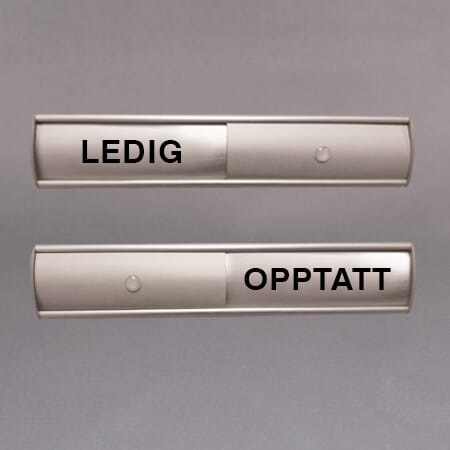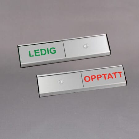 Populære og praktiske ledig/opptatt skilt. perfekt for kontoret. Bytt mellom ledig og opptatt ved å skyve dekslet til ledig eller opptatt. Solid kvalitet i aluminium med teksten LEDIG OPPTATT i grønn og rød farge. Leveres med dobbeltsidig tape.