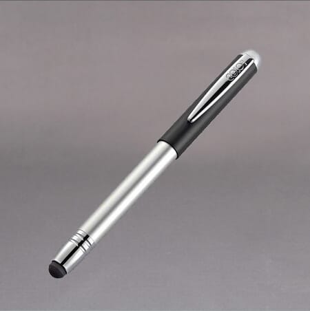 Stempel og kulepenn i ett. Aluminium. krom og sort flott finish. Leveres med sort farge på avtrykket, som kan bestå av 2 linjer. Byttbar refill gjør levetiden lang.