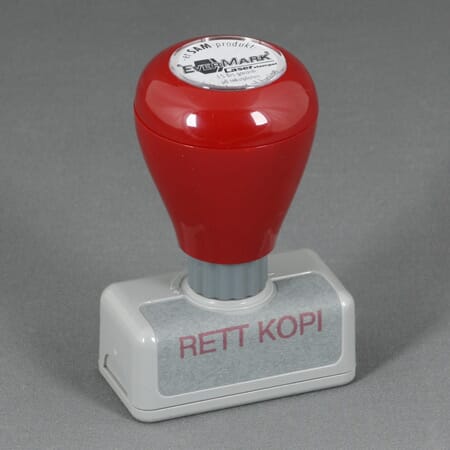 RETT KOPI - Selvfargende stempel med lasergravert tekst plate i naturgummi. Klar for tusenvis av avtrykk. Kan enkelt gjeninnfarges. Leveres komplett med beskyttelseslokk og tydelig index som viser teksten på stempelet.