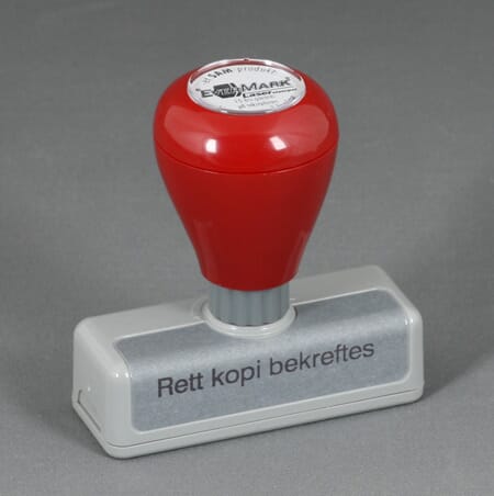 RETT KOPI BEKREFTES - Selvfargende stempel med lasergravert tekst plate i naturgummi. Klar for tusenvis av avtrykk. Kan enkelt gjeninnfarges. Leveres komplett med beskyttelseslokk og tydelig index som viser teksten på stempelet.