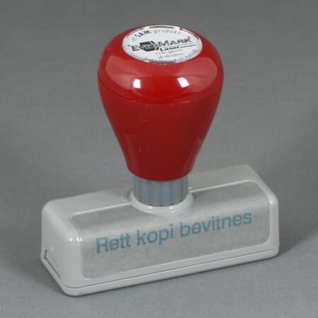 RETT KOPI BEVITNES - Selvfargende stempel med lasergravert tekst plate i naturgummi. Klar for tusenvis av avtrykk. Kan enkelt gjeninnfarges. Leveres komplett med beskyttelseslokk og tydelig index som viser teksten på stempelet.