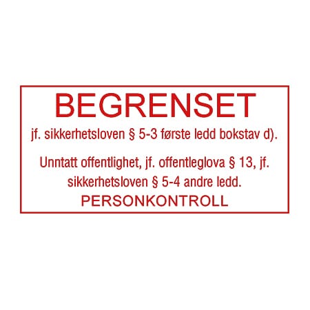 Graderingsstempel med tekst Begrenset Personkontroll iht. sikkerhetsloven anbefalt av juridisk avdeling i Forsvarsdepartement. Selvfargende stempel hvor avtrykket måler 62 x 25mm