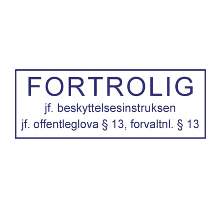 Graderingsstempel med tekst Konfidensielt iht. sikkerhetsloven anbefalt av juridisk avdeling i Forsvarsdepartement. Selvfargende stempel hvor avtrykket måler 62 x 25m